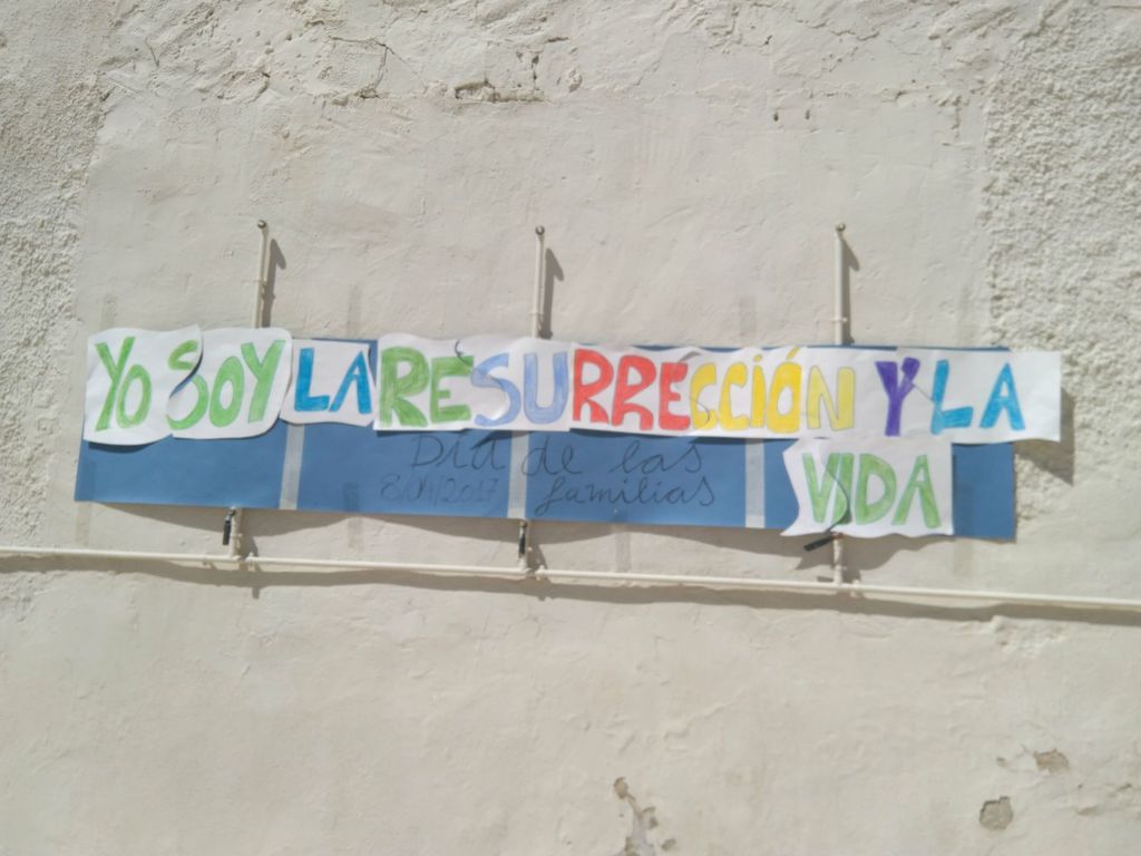Jugamos padres e hijos en el patio del Parroquial (¡qué calor!!!), y los diez ganadores de los diez jjuegos recibieron de "premio" la pieza de un rompecabezas que debían armar y pegar en el muro del patio para poder leer una frase: "Yo soy la resurrección y la vida"... ¡claro que sí!