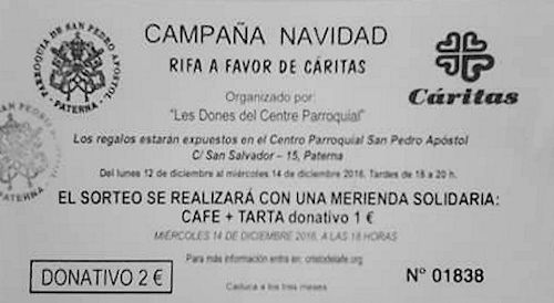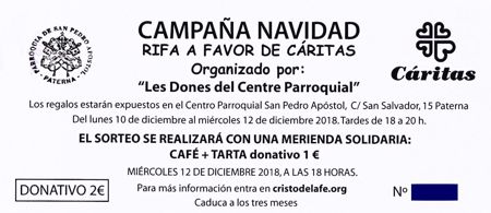 Ya se encuentra a la venta la rifa solidaria de Navidad en beneficio de Cáritas parroquial, preparada por Les Dones del Centre Parroquial